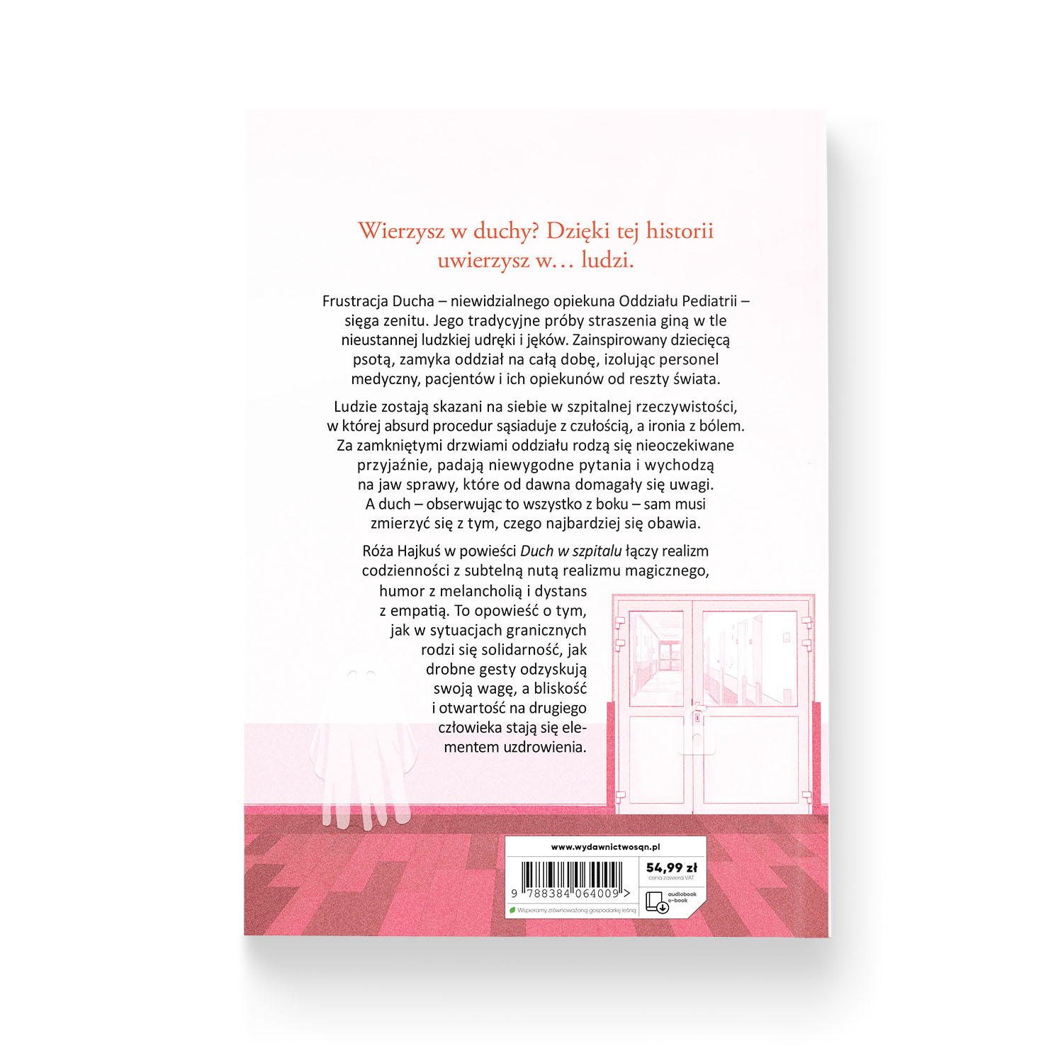 Róża Hajkuś w powieści Duch w szpitalu łączy realizm codzienności z subtelną nutą realizmu magicznego, humor z melancholią i dystans z empatią. To opowieść o tym, jak w sytuacjach granicznych rodzi się solidarność, jak drobne gesty odzyskują swoją wagę, a bliskość i otwartość na drugiego człowieka stają się elementem uzdrowienia.