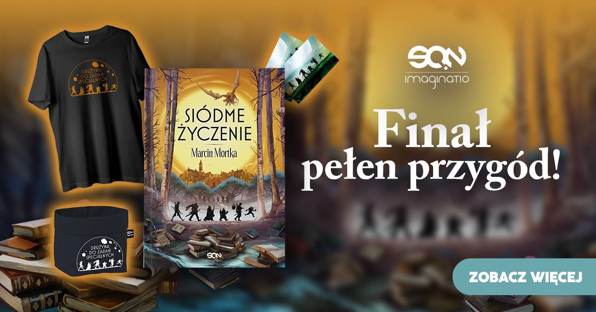 Najważniejsze to nie zwrócić na siebie uwagi bogów… A nie, to nie ta bajka. W Siódmym Życzeniu to Dola i Los są łaskawi. Byle tylko nie spotkać na swojej drodze żadnych książąt, niewidzialnych królowych, upiorów ani smoków, bo Złe wciąż czai się w mroku. Najnowsza książka Marcina Mortki do ostatniej strony trzyma w napięciu, na zmianę dławiąc czytelnika strachem o los bohaterów i zmuszając go śmiechu dzięki zabawnym dialogom.